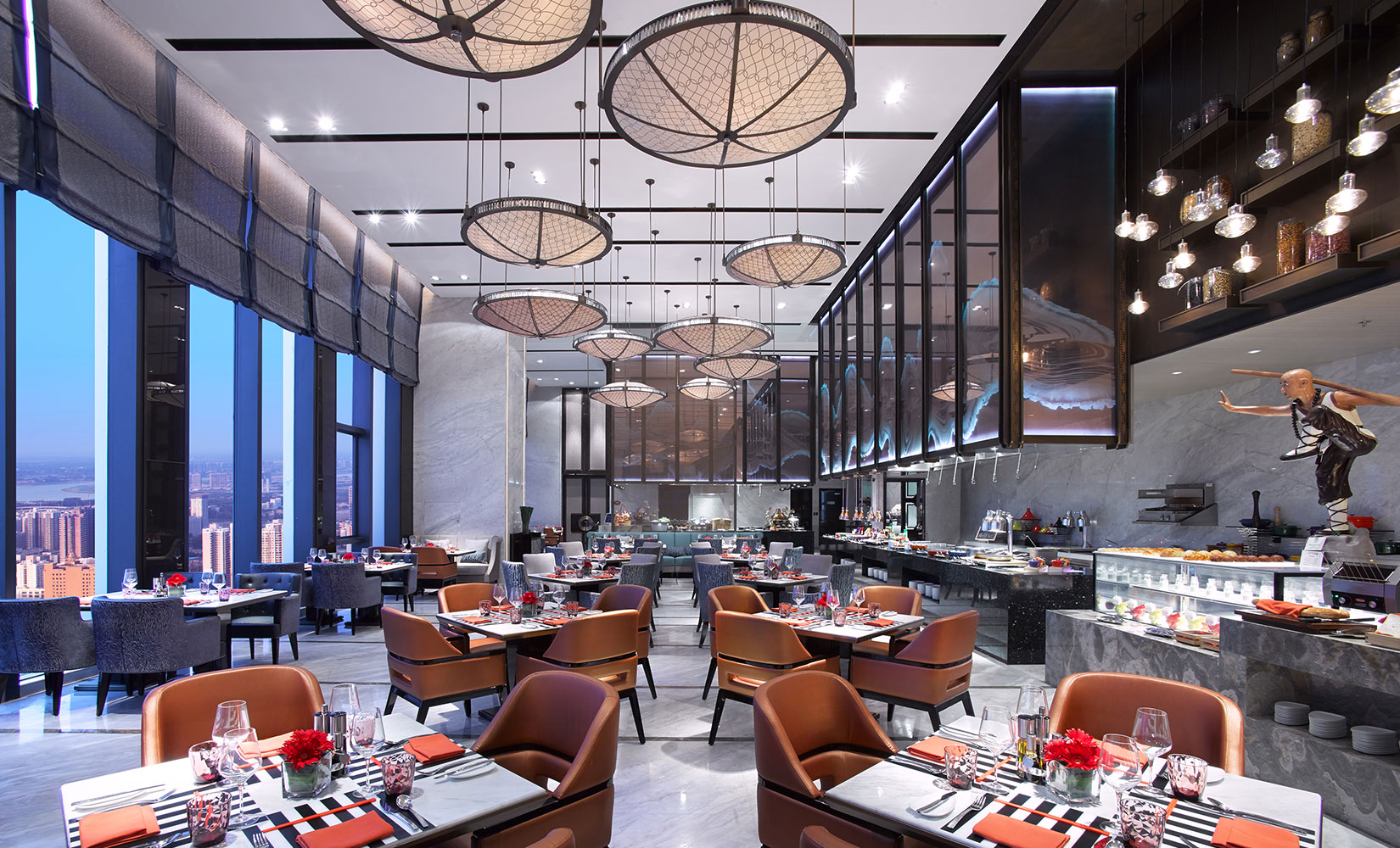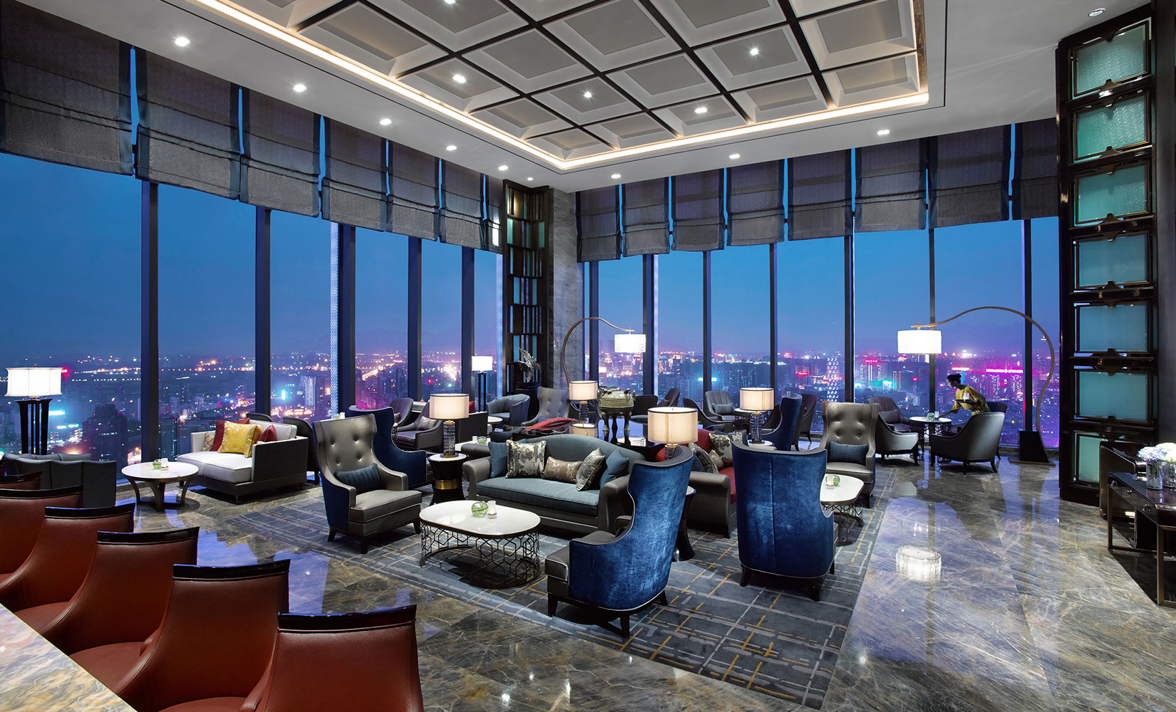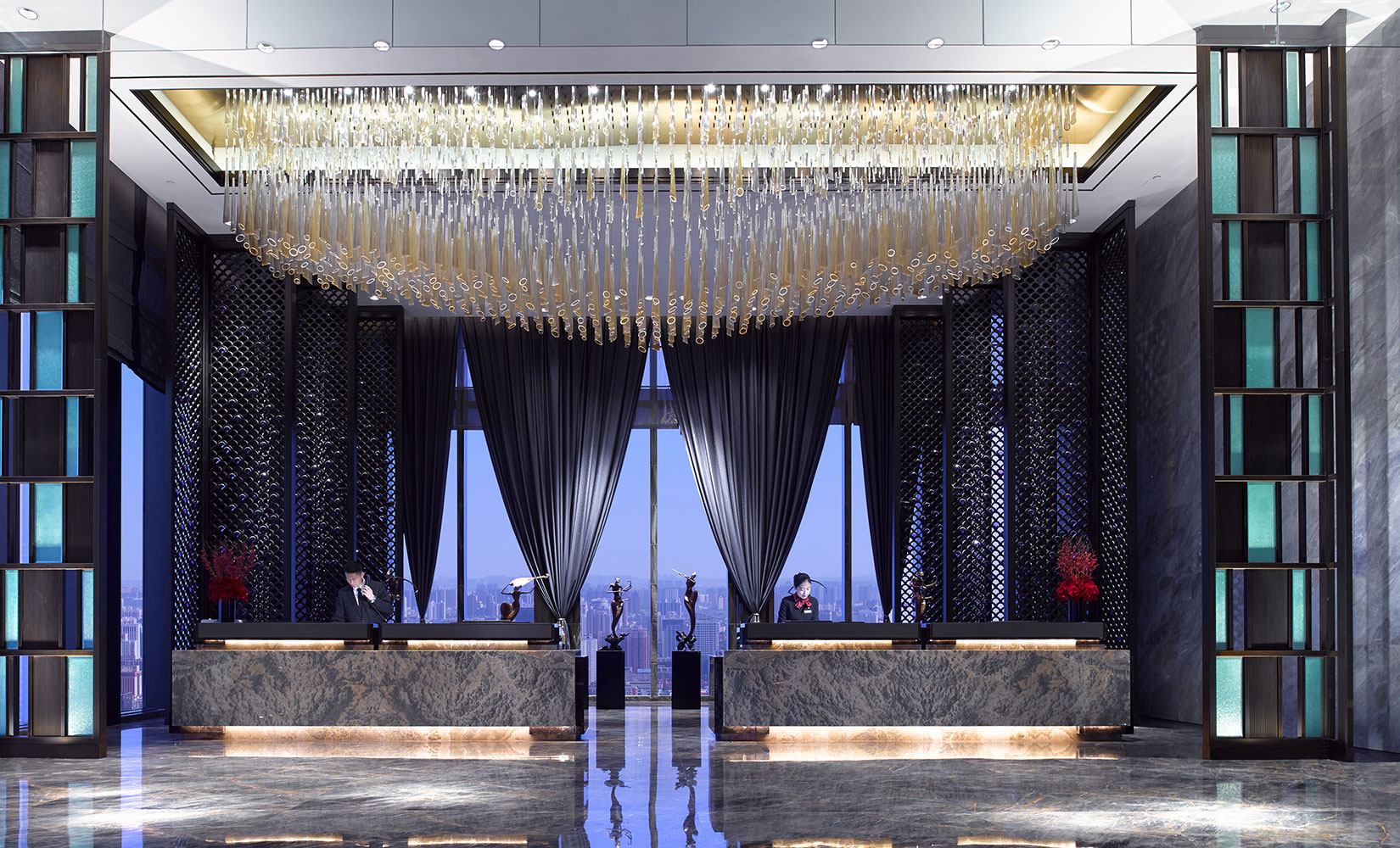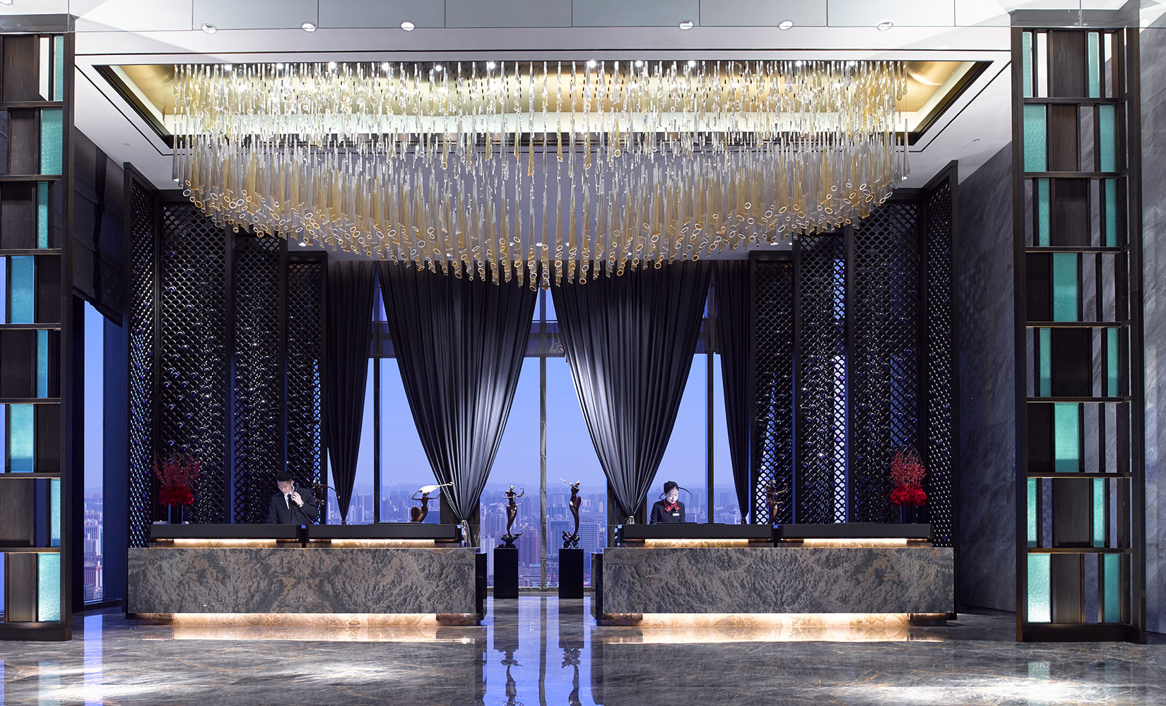 作为郑州市最高的空中酒店大堂,可通过多面落地窗享受大广角城市美景。大堂顶部的大型水晶灯创造灵感来自“黄河之水天上来”,由1.6万片不同颜色的水晶片通过纯手工穿连而成,气势磅礴,光影流动,摇曳生辉。