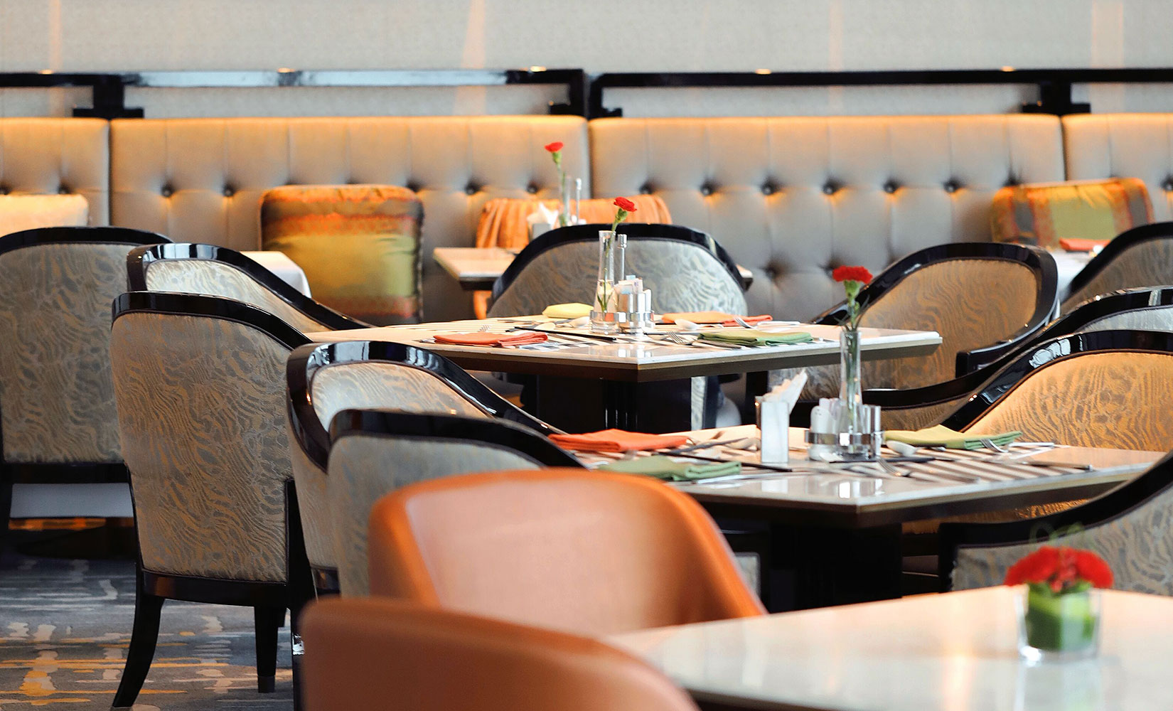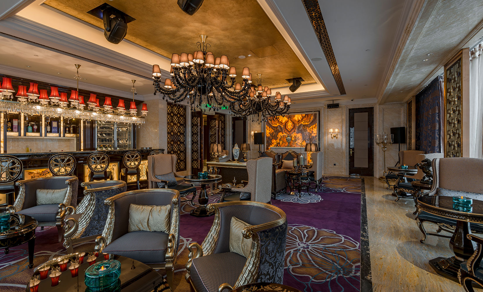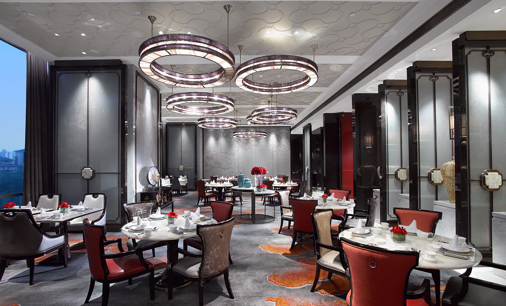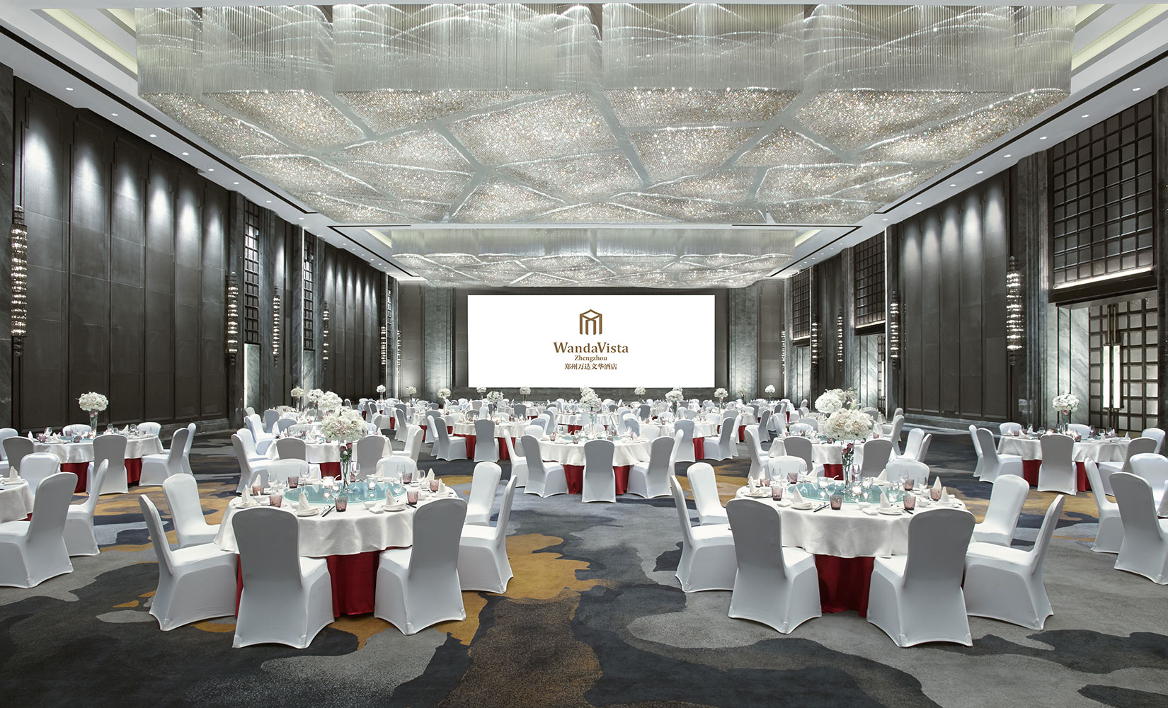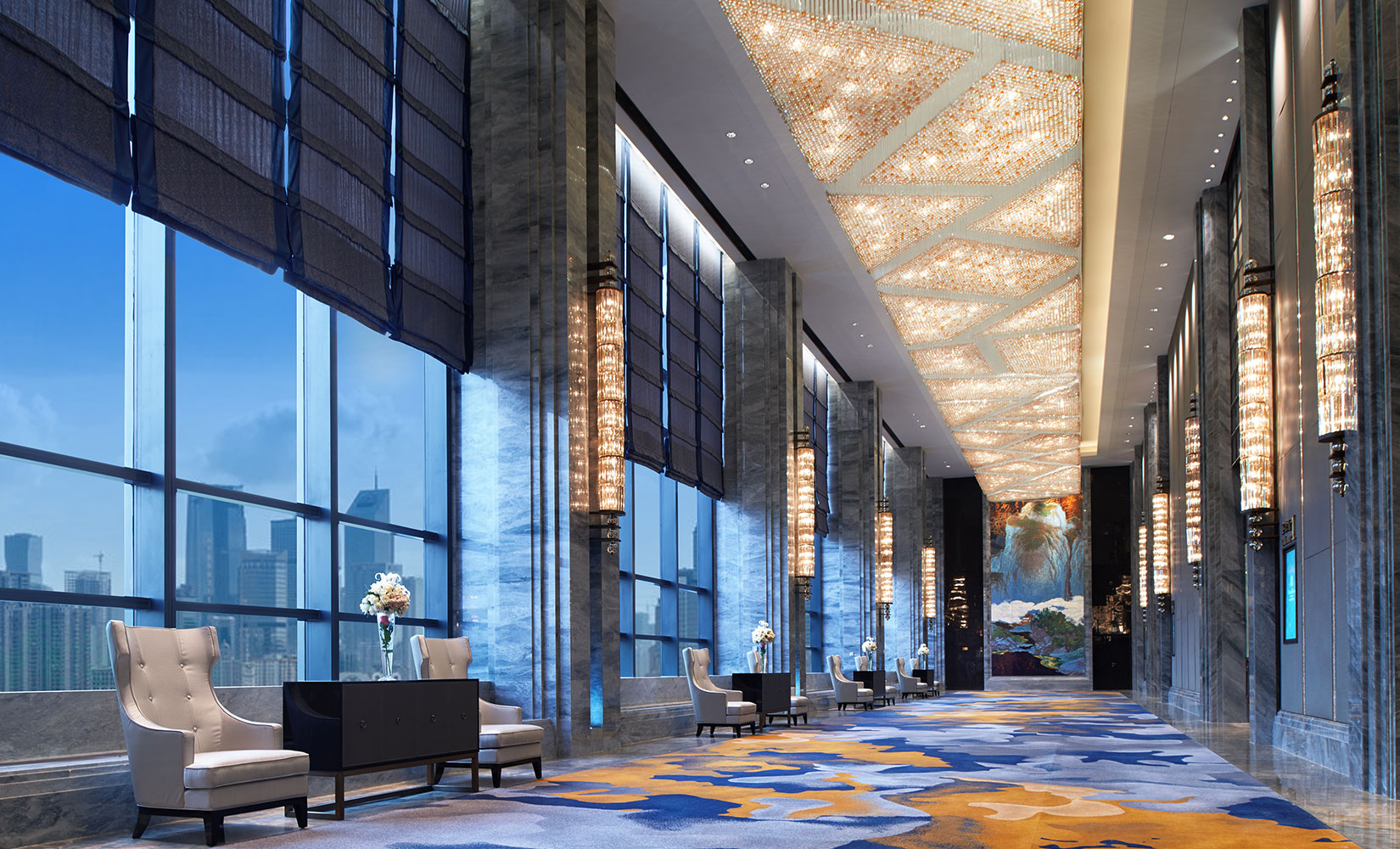 作为郑州市最高的空中酒店大堂,可通过多面落地窗享受大广角城市美景。大堂顶部的大型水晶灯创造灵感来自“黄河之水天上来”,由1.6万片不同颜色的水晶片通过纯手工穿连而成,气势磅礴,光影流动,摇曳生辉。
